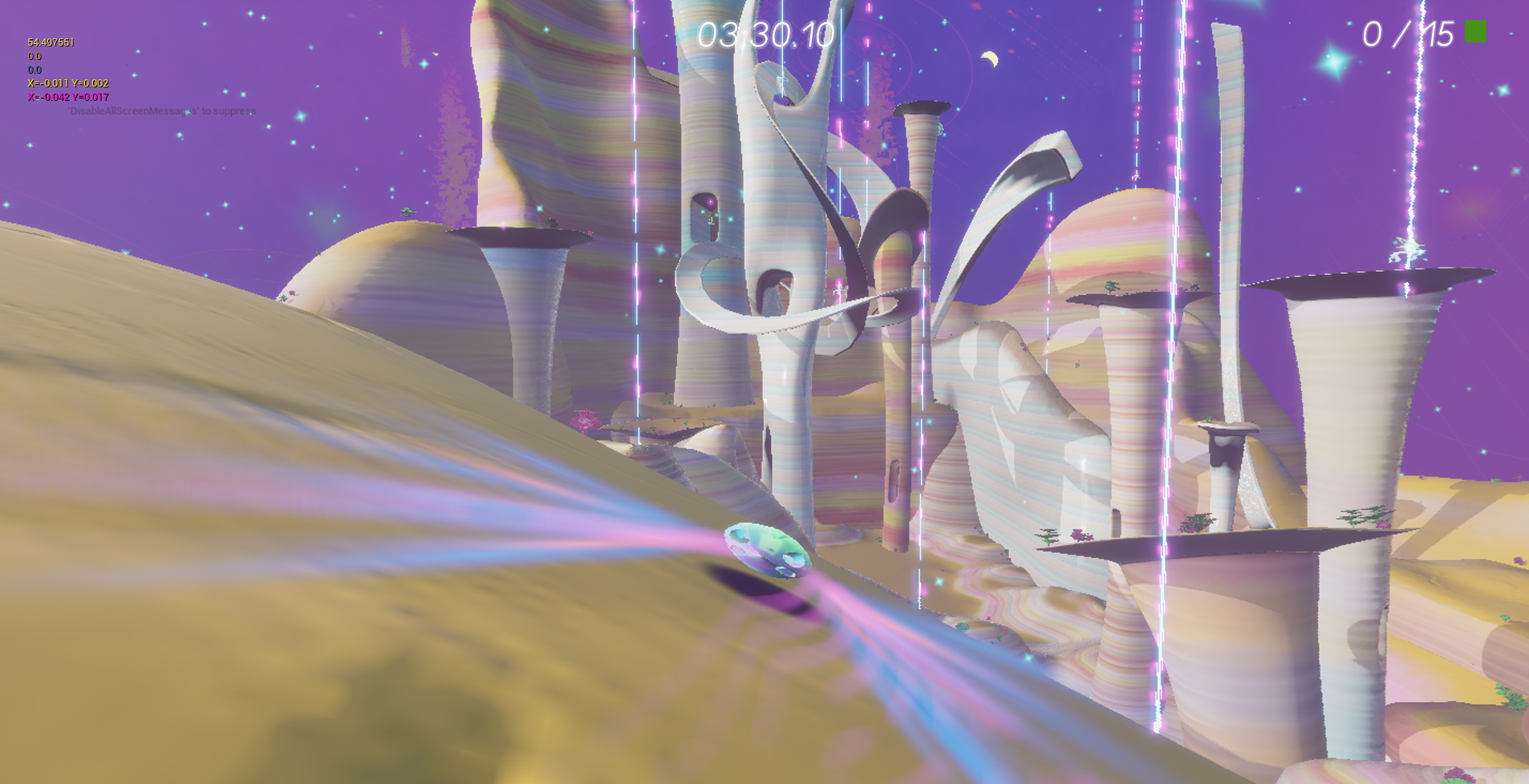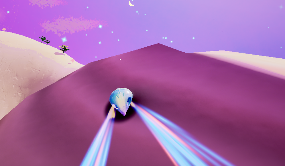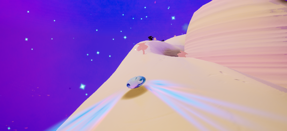 In F4R you explore a distant canyon world as Floaty. The goal is to collect all scattered stars as quickly as possible. The gliding movement defines both the controls and the overall feel of movement: motion is fluid on the ground, on walls, and in the air. A rush can be used from any surface, and a wallrun from any wall.